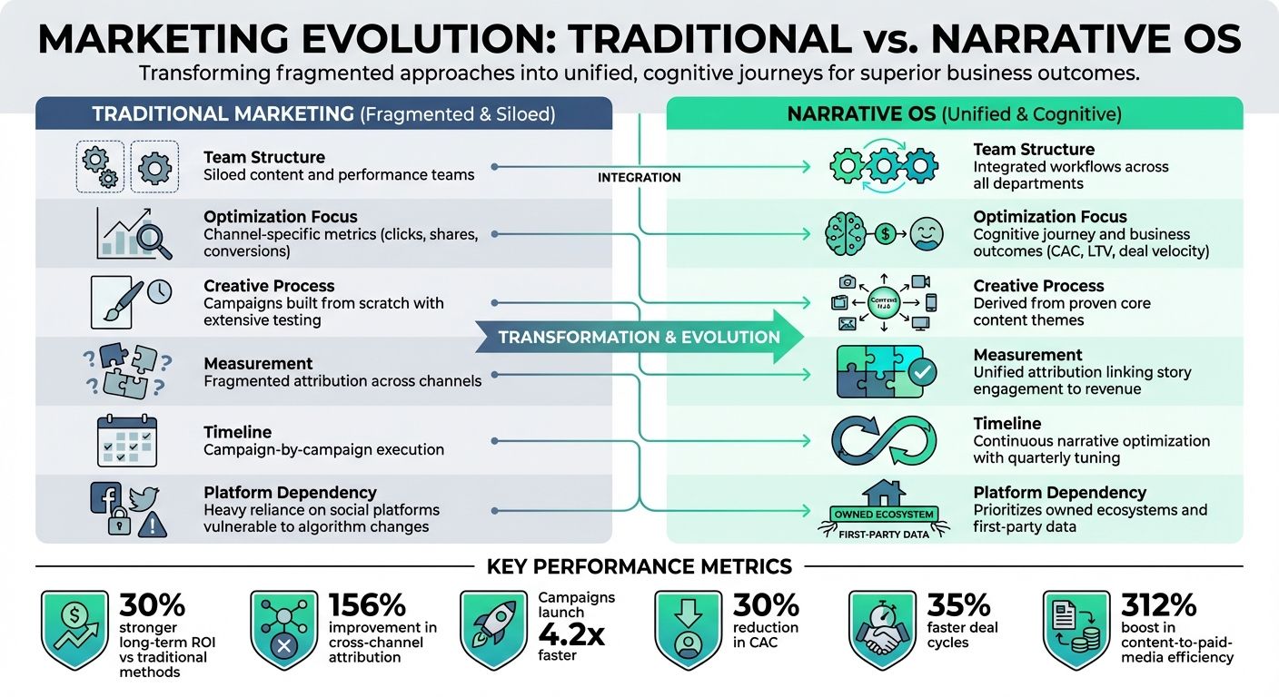 The NOS measurement framework tracks content engagement, campaign performance, and attribution metrics—connecting content interactions to actual conversions. Key indicators include channel-specific CAC breakdowns, deal velocity by narrative touchpoint, LTV:CAC ratios, and win rate changes pre- and post-installation. The system factors in total costs, not just ad spend, to give an accurate picture.